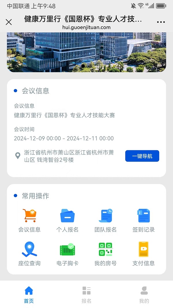 會議首頁定制內容包括會議信息,個人報名,團隊報名,簽到記錄,座位查詢,電子胸卡,我的房號,支付信息等內容板塊。
