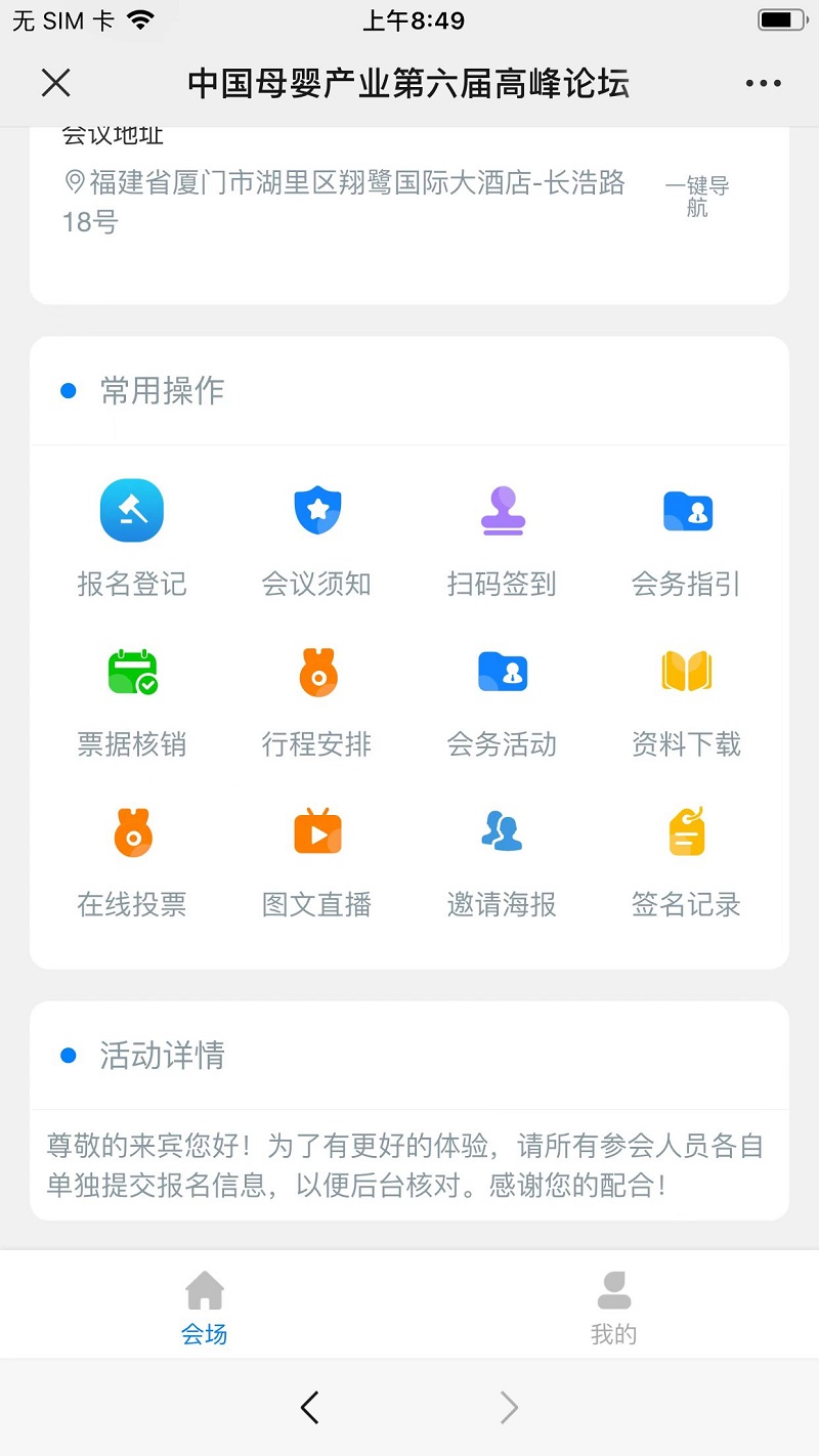 會(huì)議使用的功能有:報(bào)名登記、會(huì)議須知、掃碼簽到、會(huì)務(wù)指引、票據(jù)核銷、行程安排,會(huì)務(wù)活動(dòng),資料下載,在線投票,圖文直播,邀請(qǐng)海報(bào),簽名記錄。