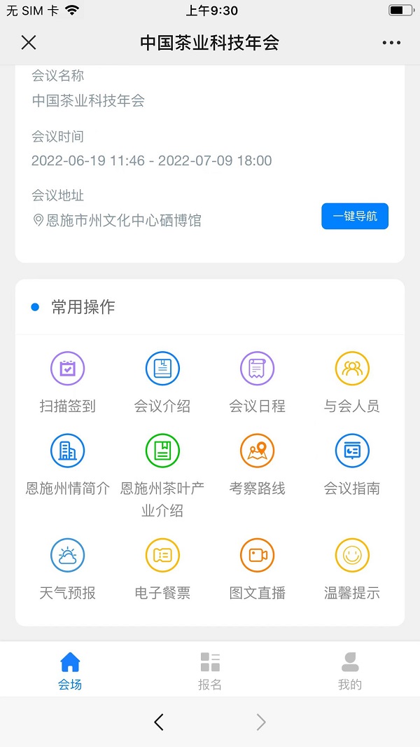會場包括掃描簽到,會議介紹,會議日程,與會人員,恩施州情簡介,恩施州茶葉產業(yè)介紹,考察路線,會議指南,天氣預報,電子餐券,圖文直播,溫馨提示等模塊。